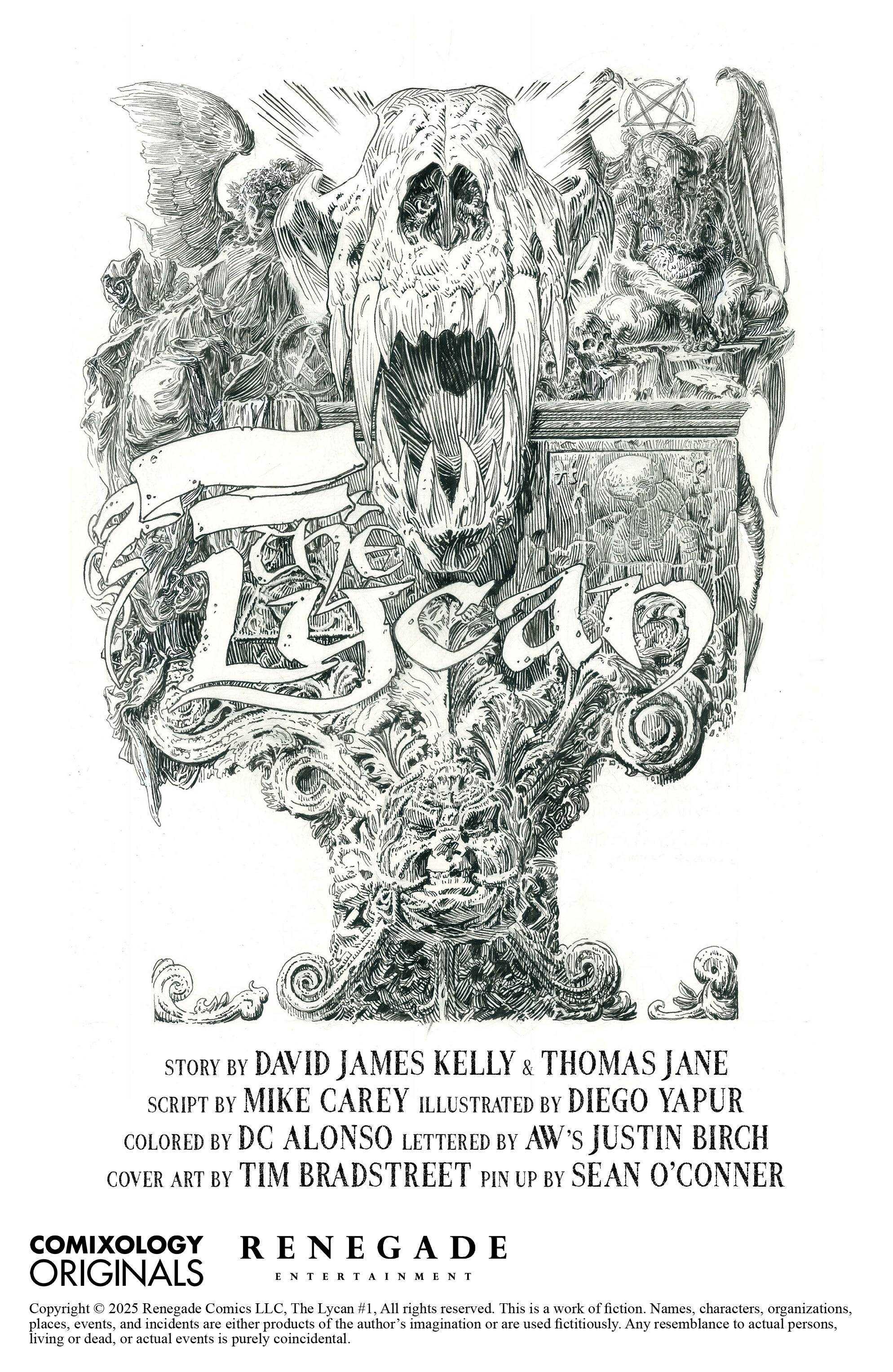 Lycan은 Jane, 시나리오 작가 David James Kelly (Logan), 작가 Mike Carey (Lucifer,The Unpritten), 아티스트 Diego Yapur, Colorist D.C. Alonso 및 Letterer and World 디자인 간의 공동 작업입니다. Tim Bradstreet (Punisher Max,hellblazer)는 커버 아트에 기여합니다.