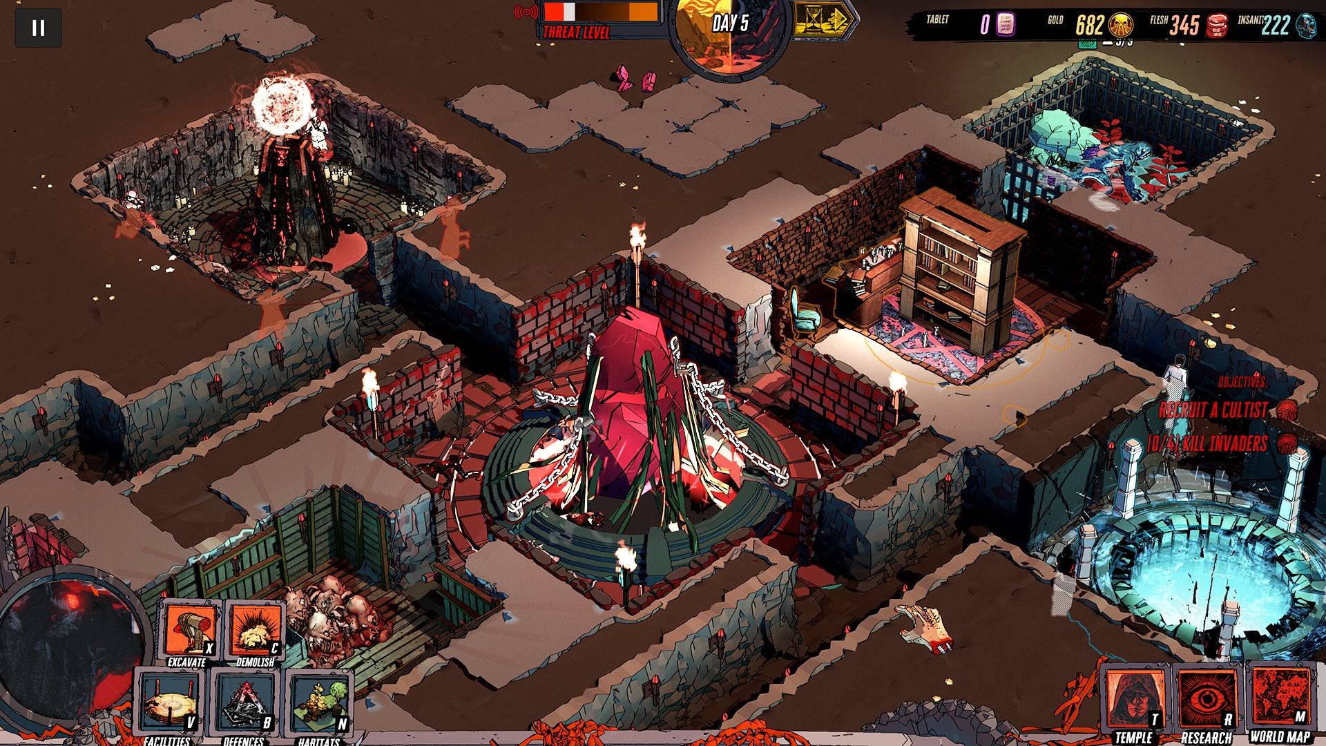 Situado na década de 1920, os jogadores construem um covil sinistro, aprofundam o conhecimento proibido para convocar monstros Lovecraftianos e expandir sua influência recrutando seguidores e concluindo os objetivos. Naturalmente, os cultos rivais e as autoridades representam uma ameaça, necessitando da implantação estratégica de armadilhas e feitiços para proteger o covil.