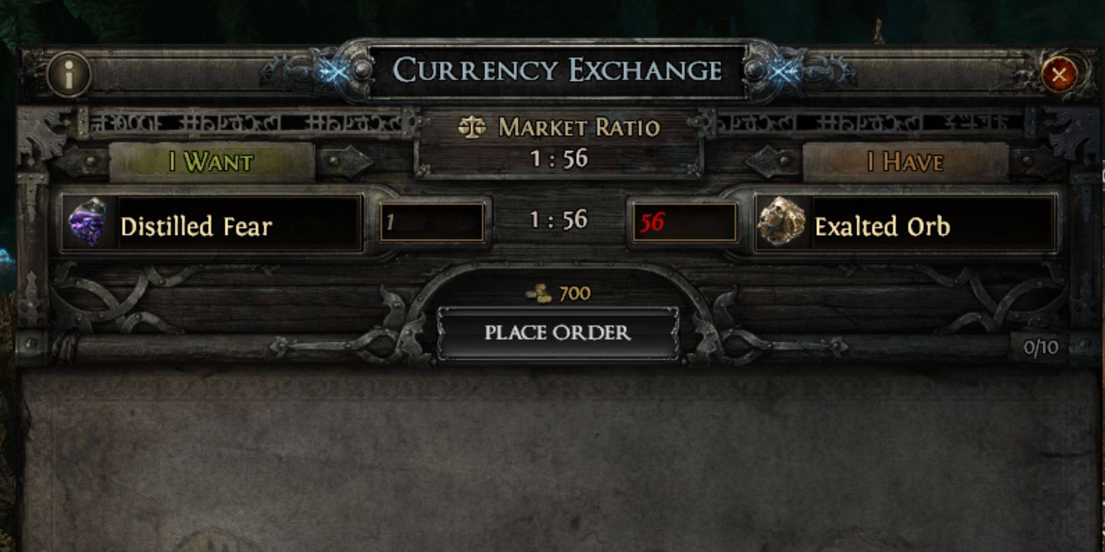 - Nem todas as combinações de moeda são trocáveis. Se uma conversão não for possível (por exemplo, orbes divinas para rolos de sabedoria), nenhuma proporção será exibida.